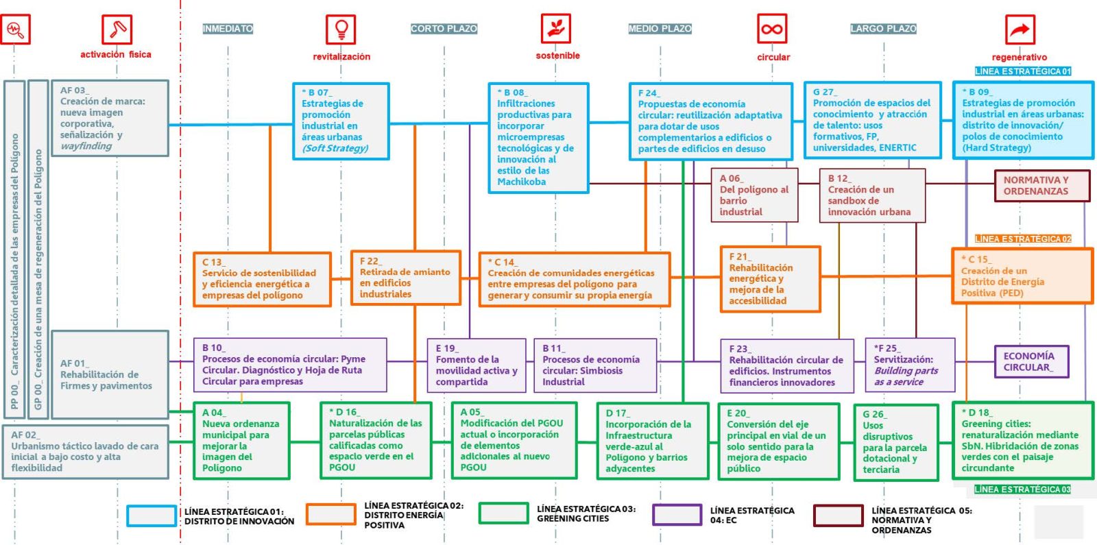Ahora bien, esta curva teórica necesita una traducción operativa para resultar útil en la práctica. Nuestra metodología establece para ello un sistema de actuación escalar que organiza las intervenciones en un gradiente de complejidad creciente: desde el lavado de cara inicial y la instalación de servicios básicos, pasando por la revitalización ligera y pesada, la remodelación, la transformación, hasta la regeneración integral. Este gradiente no es una secuencia rígida que deba recorrerse paso a paso de forma lineal. Es, más bien, un mapa de posibilidades donde cada polígono se sitúa en un punto diferente y donde las intervenciones de distintos niveles pueden , y deben coexistir en el tiempo. Un polígono puede estar acometiendo su lavado de cara (urbanismo táctico de bajo coste y alta flexibilidad para generar concienciación y victorias rápidas) mientras simultáneamente diseña su comunidad energética (una actuación de nivel restaurador) y negocia con el ayuntamiento la creación de un sandbox regulatorio (una intervención de nivel regenerativo).