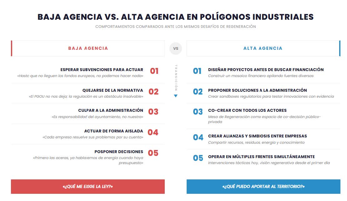 La tesis que articula este análisis es la siguiente: la verdadera regeneración de un polígono industrial no es una operación estética o lo que coloquialmente podríamos llamar un «lavado de cara» consistente en repavimentar calles y pintar fachadas, sino la creación de las condiciones para que emerja un comportamiento de alta agencia que permita transitar desde modelos meramente sostenibles (que aspiran a no dañar) hacia modelos genuinamente regenerativos (que devuelven valor al territorio).