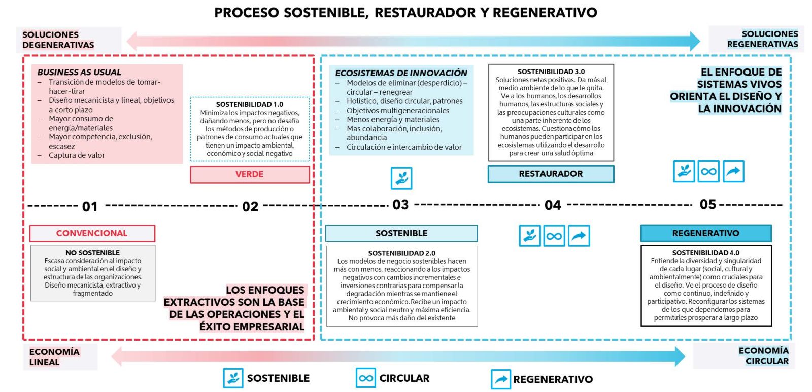 Lo que resulta particularmente esclarecedor de este modelo es la transición que propone entre dos paradigmas económicos. En el extremo izquierdo de la curva opera la economía lineal, donde los enfoques extractivos constituyen la base del éxito empresarial: transición de modelos de tomar-hacer-tirar, diseño mecanicista con objetivos a corto plazo, mayor consumo de energía y materiales, competencia, exclusión, escasez y captura de valor. En el extremo derecho emerge lo que podríamos denominar un sistema de innovación gobernado por la economía circular: modelos de eliminar desperdicio, circular y regenerar; diseño holístico y circular; objetivos multigeneracionales; menor consumo de energía y materiales; más colaboración, inclusión, abundancia; y circulación e intercambio de valor. El enfoque de sistemas vivos sustituye al diseño mecanicista como principio rector de la innovación.